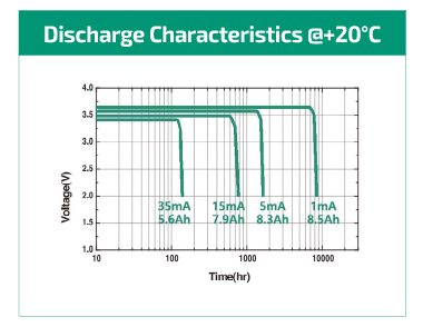 ※ 0.1초 펄스 전류 기준 수치는, 20°C 환경에서 2분 간격으로방전 테스트 시 측정되었으며, 초기 비방전 셀에서 10μA 기준 전류 상태로 시작하여 전압이 3.0V 이상 유지됨을 의미합니다.